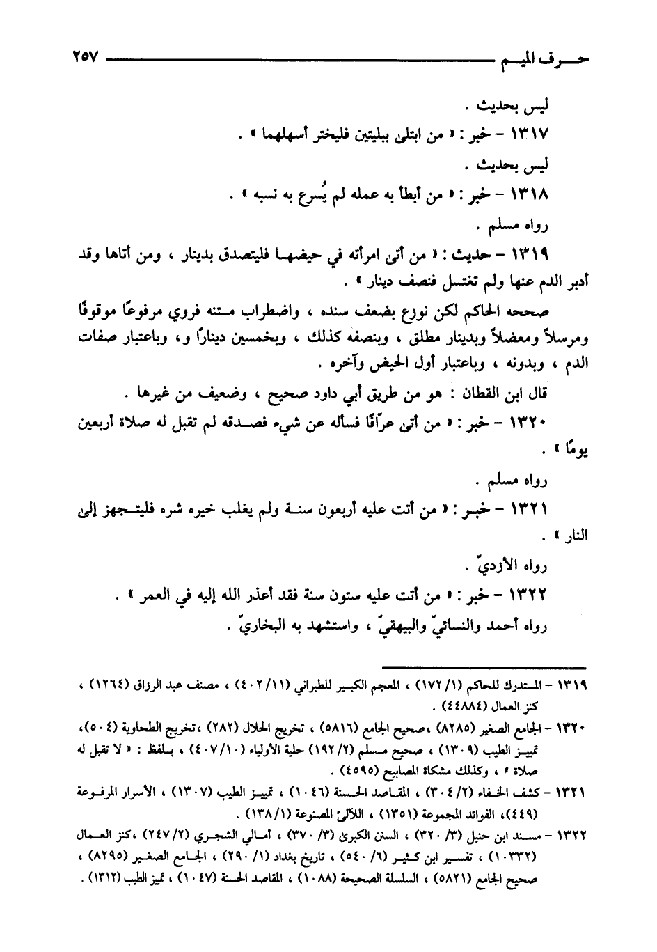 1319 - حَدِيث: " من أَتَى امرأء فِي حَيْضهَا فليتصدق بِدِينَار، وَمن أَتَاهَا وَقد أدبر الدَّم عَنْهَا وَلم تَغْتَسِل فَنصف دِينَار ". صَححهُ الْحَاكِم لَكِن نوزع بِضعْف سَنَده، واضطراب مَتنه فَروِيَ مَرْفُوعا مَوْقُوفا ومرسلا ومعضلا وبدينار مُطلق، وبنصفه كَذَلِك، وبخمسين دِينَارا و، بِاعْتِبَار صِفَات الدَّم، وبدونه، وَبِاعْتِبَار أول الْحيض وَآخره. قَالَ ابْن الْقطَّان: هُوَ من طَرِيق أبي دَاوُد صَحِيح، وَضَعِيف من غَيرهَا.