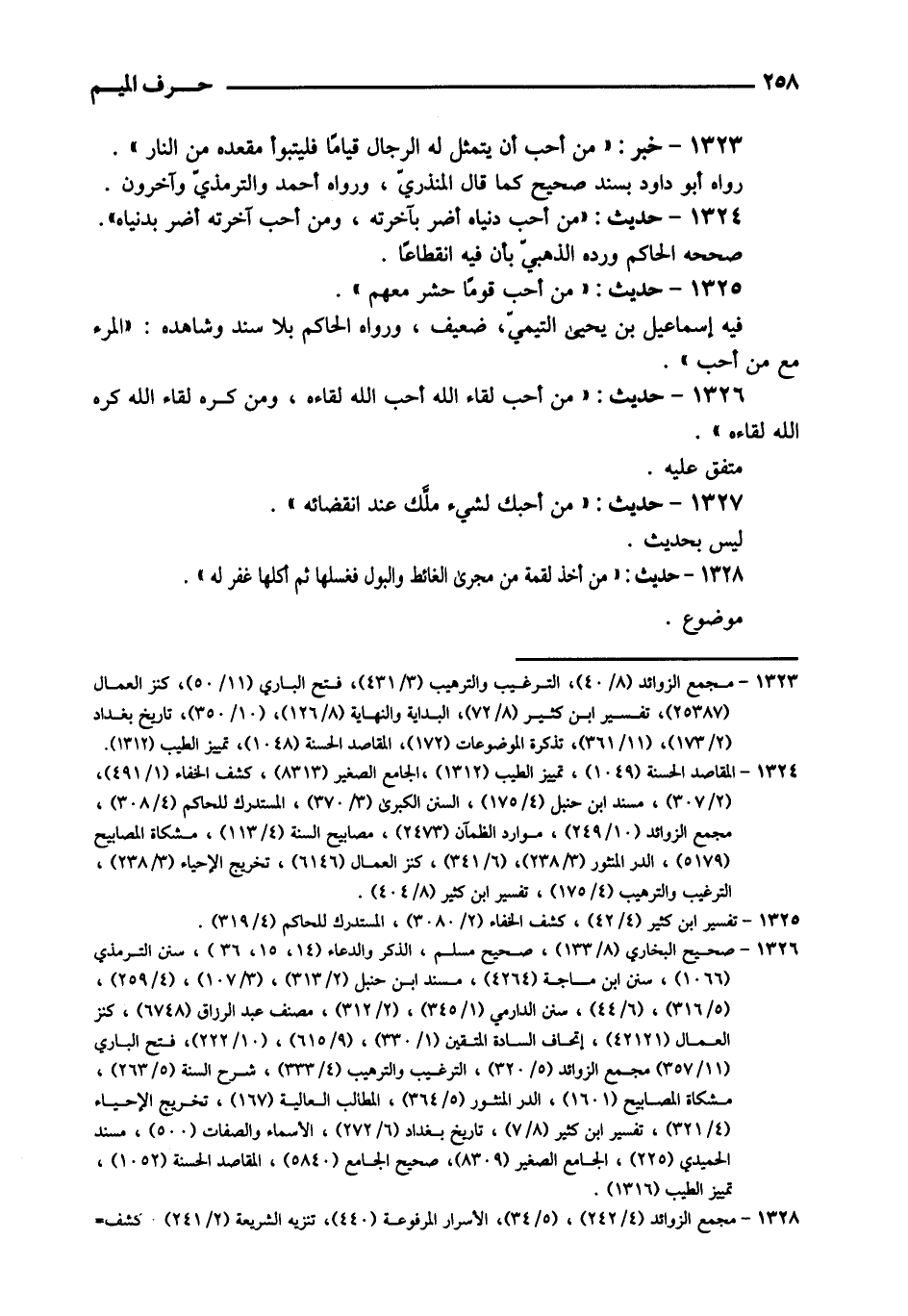 1325 - حَدِيث: " من أحب قوما حشر مَعَهم ". فيع إِسْمَاعِيل بن يحيى التَّيْمِيّ، ضَعِيف، وَرَوَاهُ الْحَاكِم بِلَا سَنَد وَشَاهده: " الْمَرْء مَعَ من أحب ".