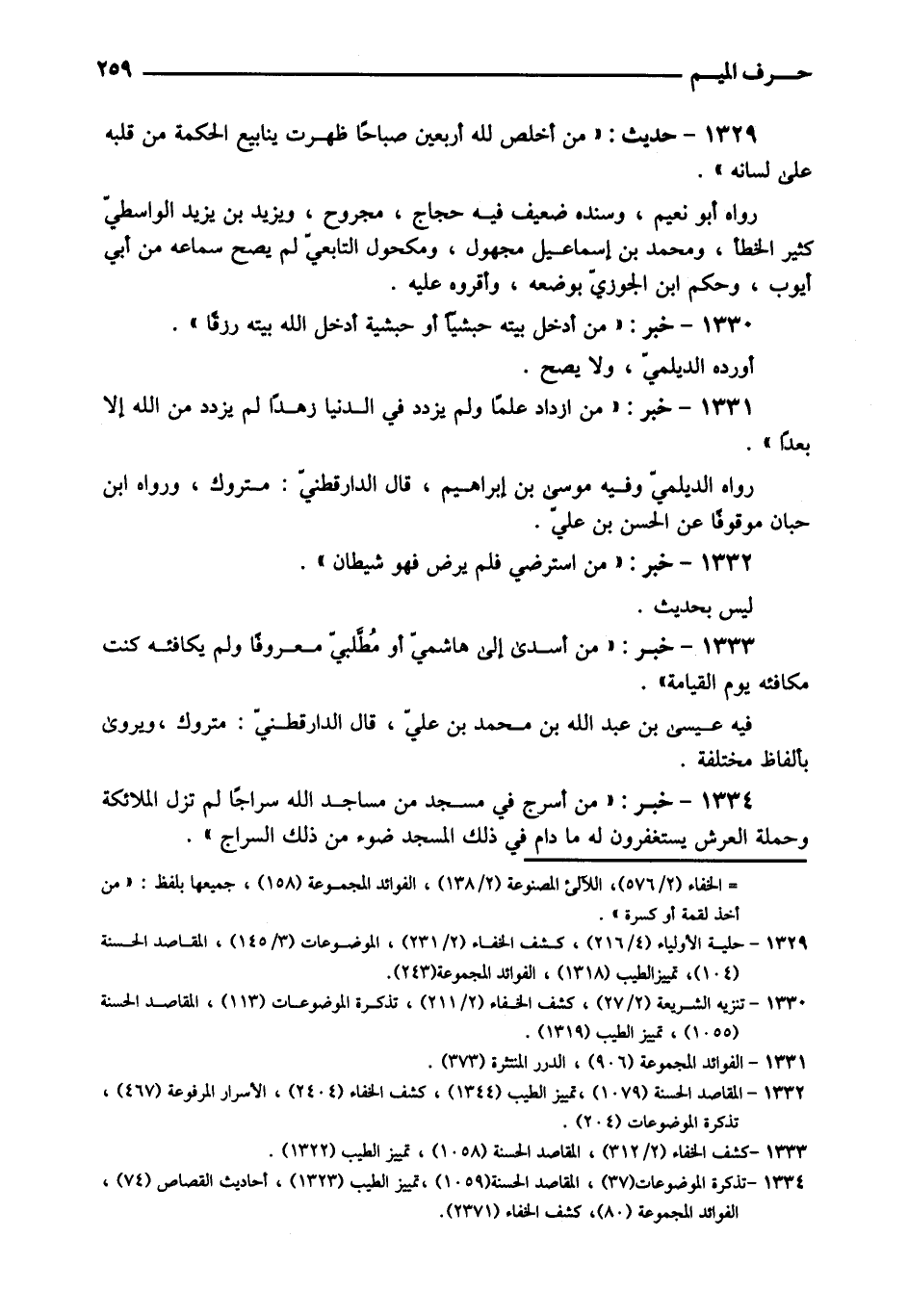 1333 - خبر: " من أسدي إِلَى هاشمي أَو مطلبي مَعْرُوفا وَلم يُكَافِئهُ كنت مكافئه يَوْم الْقِيَامَة ". فِيهِ عِيسَى بن عبد الله بن مُحَمَّد بن عَليّ، قَالَ الدَّارَقُطْنِيّ: مَتْرُوك، ويروى بِأَلْفَاظ مُخْتَلفَة.