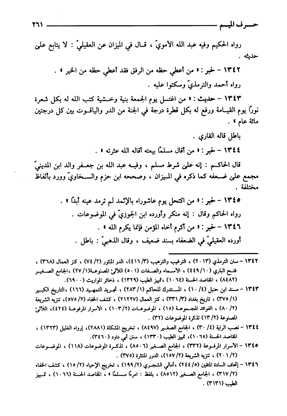 1346 - خبر: " من أكْرم أَخَاهُ الْمُؤمن فَإِنَّمَا يكرم الله ". أورد الْعقيلِيّ فِي الضُّعَفَاء بِسَنَد ضَعِيف، وَقَالَ الذَّهَبِيّ: بَاطِل.