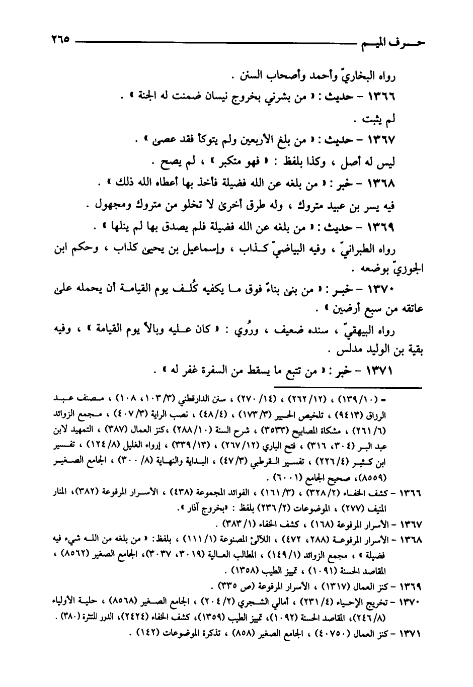 1368 - خبر: " من بلغه من الله فَضِيلَة فَأخذ بهَا أعطَاهُ الله ذَلِك ". فِيهِ يسر بن عبيد مَتْرُوك، وَله طرق أُخْرَى لَا تَخْلُو من مَتْرُوك ومجهول.