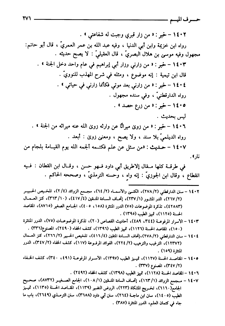 1404 - خبر: " من زارني بعد موتِي فَكَأَنَّمَا زارني فِي حَياتِي ". رَوَاهُ الدَّارَقُطْنِيّ، وَفِي سَنَده مَجْهُول.