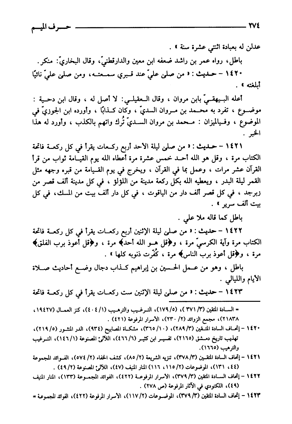 1421 - حَدِيث: " من صلى لَيْلَة الْأَحَد أَربع رَكْعَات يقْرَأ فِي كل رَكْعَة فَاتِحَة الْكتاب مرّة، وَقل هُوَ الله أحد خمس عشرَة مرّة أعطَاهُ الله يَوْم الْقِيَامَة ثَوَاب من قَرَأَ الْقُرْآن عشر مَرَّات، وَعمل بِمَا فِي الْقُرْآن، وَيخرج فِي يَوْم الْقِيَامَة من قَبره وَوَجهه مثل الْقَمَر لَيْلَة الْبَدْر، وَيُعْطِيه الله بِكُل رَكْعَة مَدِينَة من االلؤلؤ، فِي كل مَدِينَة ألف قصر من زبرجد، فِي كل قصر ألف دَار من ياقوت، فِي كل دَار ألف بَيت من الْمسك، فِي كل بَيت ألف سَرِير ". بَاطِل كَمَا قَالَه الملا عَليّ.