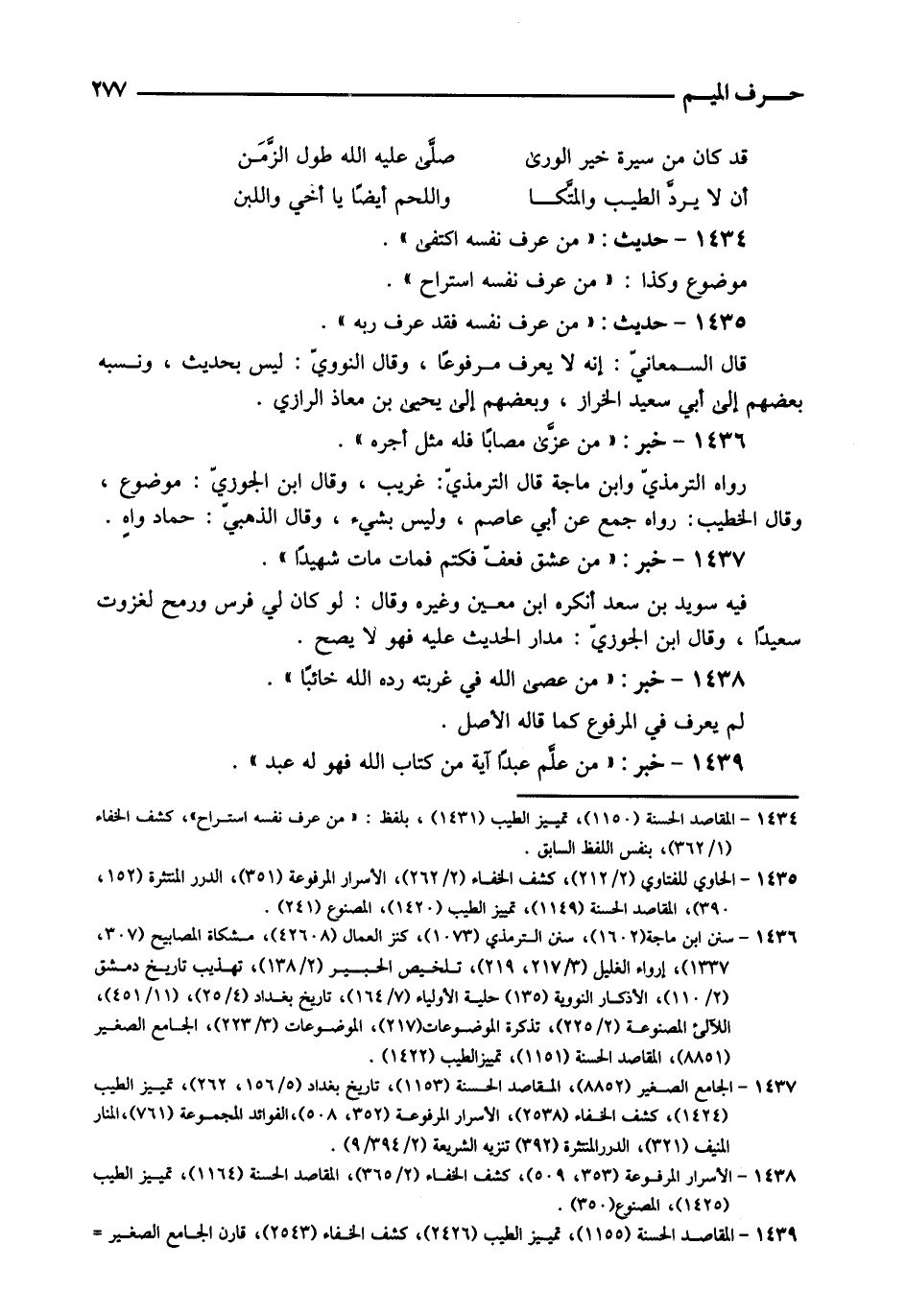 1435 - حَدِيث: " من عرف نَفسه فقد عرف ربه ". قَالَ السَّمْعَانِيّ: إِنَّه لَا يعرف مَرْفُوعا، وَقَالَ النَّوَوِيّ: لَيْسَ بِحَدِيث، وَنسبه بَعضهم إِلَى أبي سعيد الخراز، وَبَعْضهمْ إِلَى يحيى بن معَاذ الرَّازِيّ.
