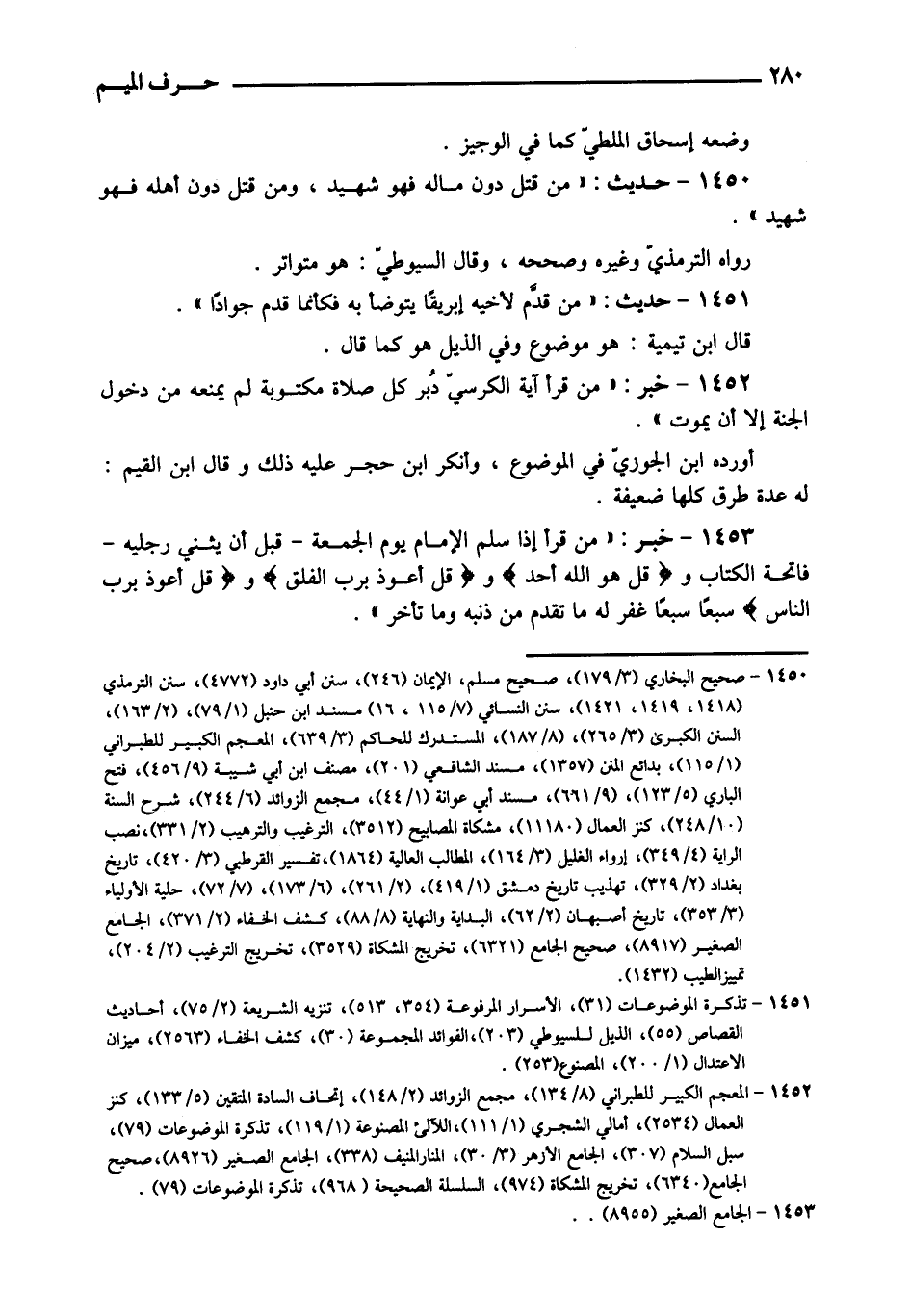 1450 - حَدِيث: " من قتل دون مَاله فَهُوَ شَهِيد، وَمن قتل دون أَهله فَهُوَ شَهِيد ". رَوَاهُ التِّرْمِذِيّ وَغَيره وَصَححهُ، وَقَالَ السُّيُوطِيّ: هُوَ متواتر.
