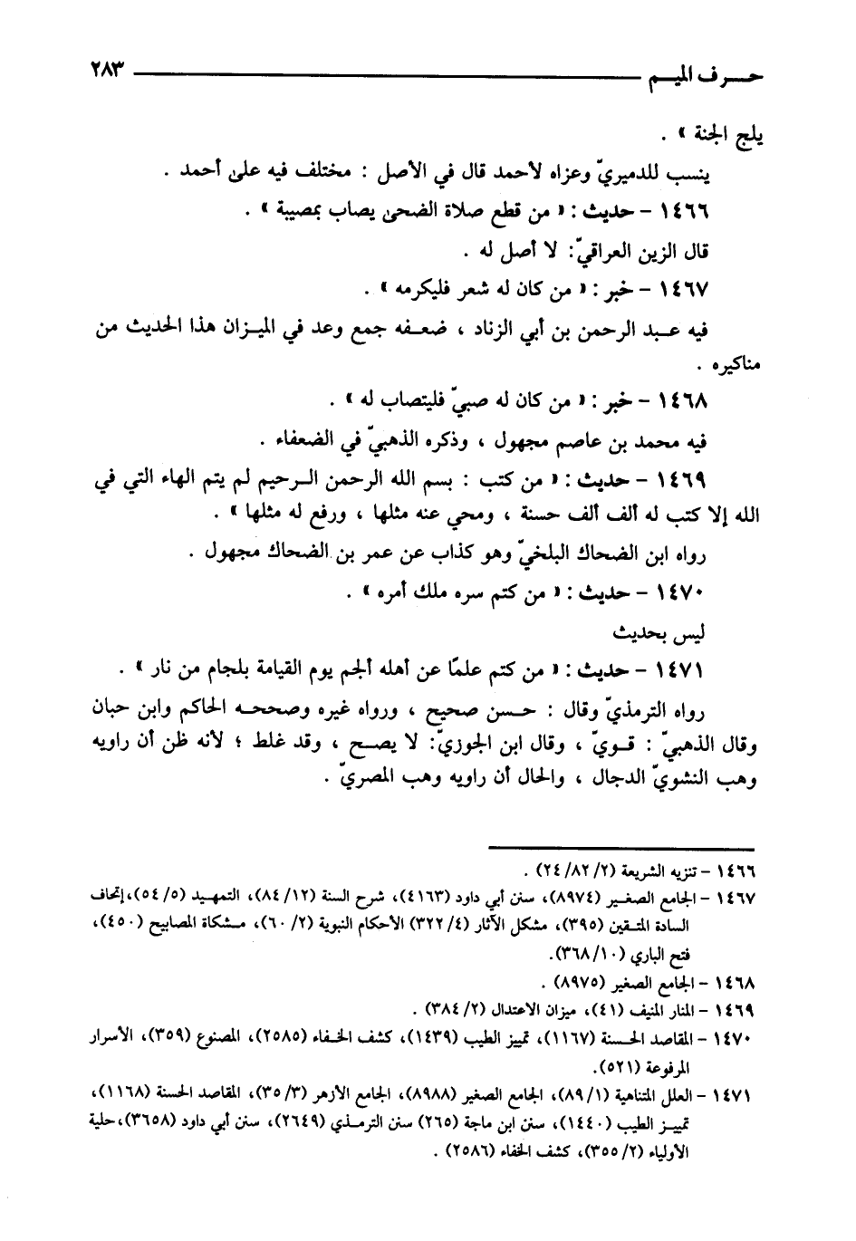 1469 - حَدِيث: " من كتب: بِسم الله الرَّحْمَن الرَّحِيم لم يتم الْهَاء الَّتِي فِي الله إِلَّا كتب لَهُ ألف ألف حَسَنَة، ومحي عَنهُ مثلهَا، وَرفع لَهُ مثلهَا ". رَوَاهُ ابْن الضَّحَّاك الْبَلْخِي وَهُوَ كَذَّاب عَن عمر بن الضَّحَّاك مَجْهُول.