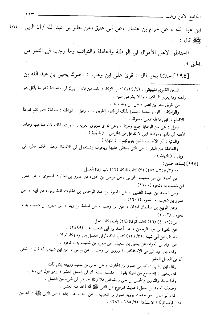 ١٩٤-[١٩٠] حدثنا بحر قال: قرئ على ابن وهب: أخبرك يحيى بن عبد الله بن ⦗١١٤⦘ سالم، عن عبد الله بن الحارث المخزومي، عن عمرو بن شعيب، عن أبيه، عن جده، أن بني شبابة بطن من فهم، كانوا يؤدون إلى النبي صلى الله عليه وسلم من نحل كان عليهم العشر من كل عشرة قرب قربة، كان يحمي لهم واديين لهم، ثم أدوا إلى عمر بن الخطاب ما كانوا يؤدون إلى النبي صلى الله عليه وسلم وحمى لهم وادييهم (¬١) .