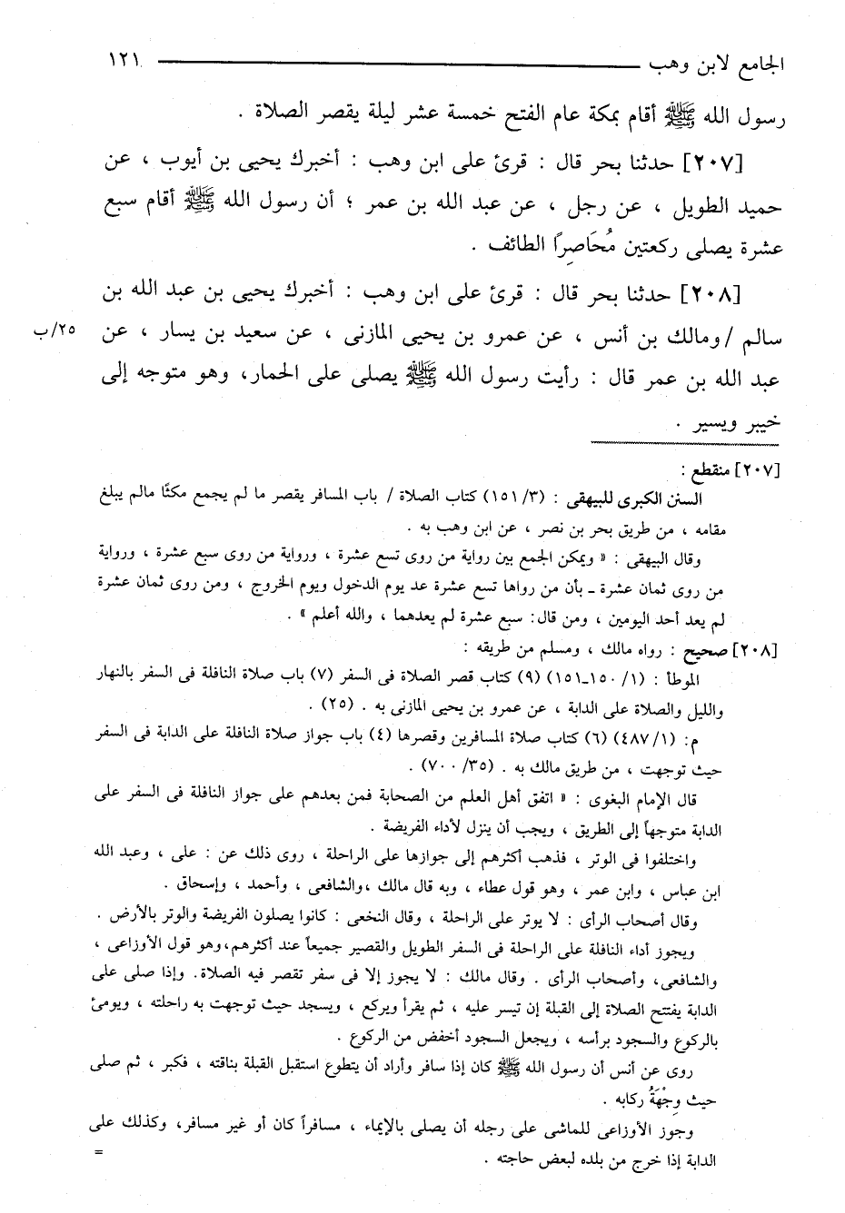 ٢٠٧-[٢٠٣] حدثنا بحر قال: قرئ على ابن وهب: أخبرك يحيى بن أيوب، عن حميد الطويل، عن رجل، عن عبد الله بن عمر؛ أن رسول الله صلى الله عليه وسلم أقام سبع عشرة يصلي ركعتين محاصراً الطائف.