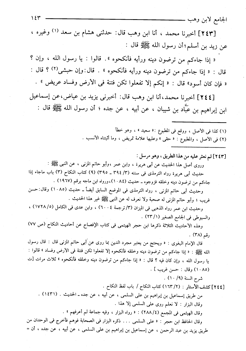 ٢٤٣-[٢٣٩] أخبرنا محمد، أنا ابن وهب قال: حدثني هشام بن سعد وغيره، عن زيد بن أسلم؛ أن رسول الله صلى الله عليه وسلم قال: