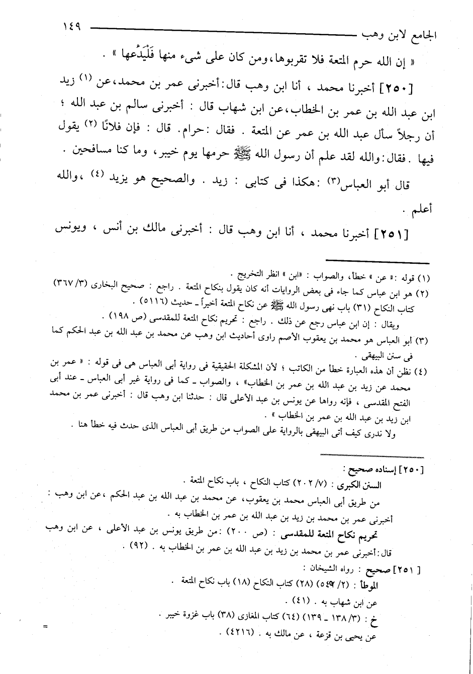 ٢٥٠-[٢٤٥] أخبرنا محمد، أنا ابن وهب قال: أخبرني عمر بن محمد، عن زيد بن عبد الله بن عمر بن الخطاب، عن ابن شهاب قال: أخبرني سالم بن عبد الله؛ أن رجلاً سأل عبد الله بن عمر عن المتعة. فقال: حرام. قال: فإن فلاناً يقول فيها. فقال: والله لقد علم أن رسول الله صلى الله عليه وسلم حرمها يوم خيبر، وما كنا مسافحين.