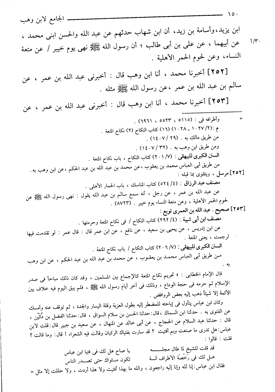 ٢٥٣-[٢٤٨] أخبرنا محمد، أنا ابن وهب قال: أخبرني عبد الله بن عمر، عن ⦗١٥١⦘ نافع، عن عبد الله بن عمر؛ أنه سئل عن متعة النساء، فقال: حرام، أما إن عمر بن الخطاب لو أخذ فيها أحداً لرجمه بالحجارة.