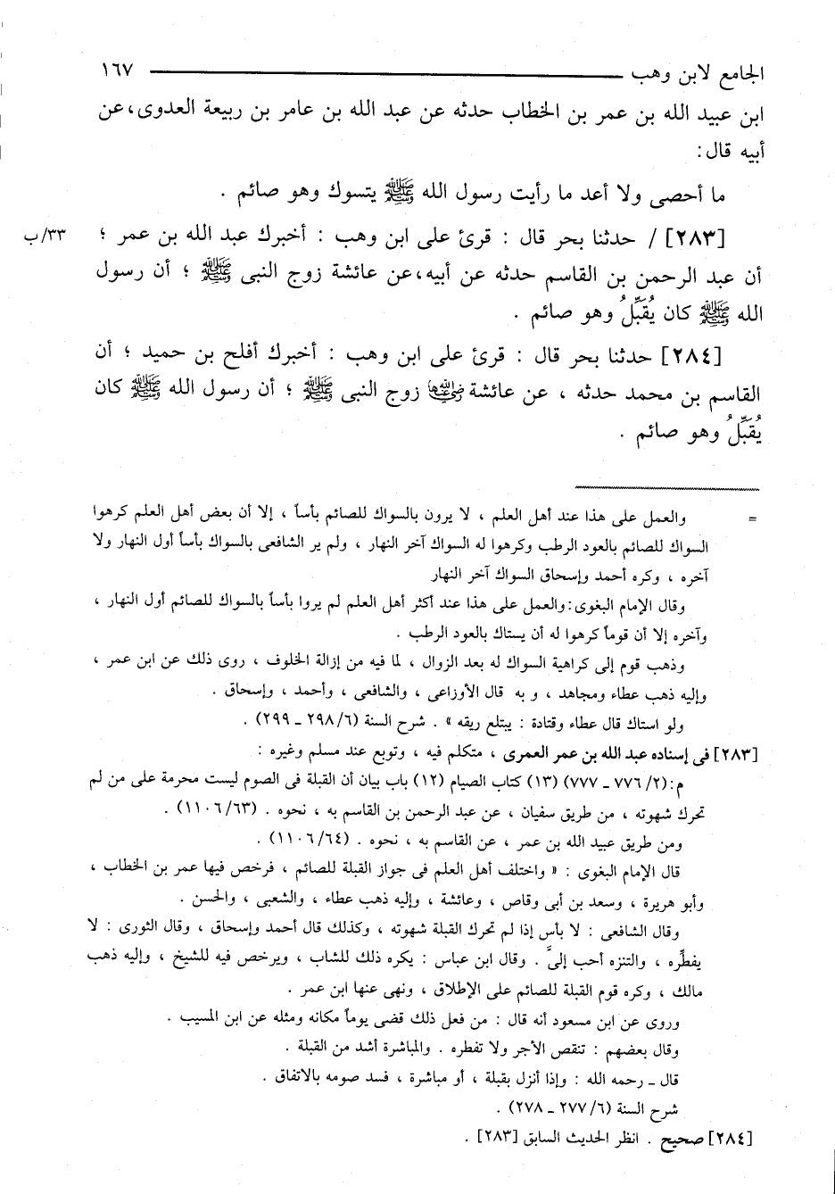 ٢٨٣-[٢٧٧] حدثنا بحر قال: قرئ على ابن وهب: أخبرك عبد الله بن عمر؛ أن عبد الرحمن بن القاسم حدثه عن أبيه، عن عائشة زوج النبي صلى الله عليه وسلم؛ أن رسول الله صلى الله عليه وسلم كان يقبل وهو صائم.