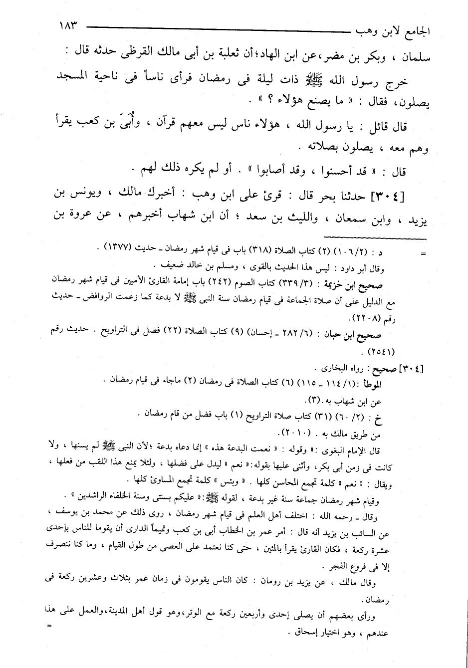 ٣٠٤-[٢٩٦] حدثنا بحر قال: قرئ على ابن وهب: أخبرك مالك، ويونس بن يزيد، وابن سمعان، والليث بن سعد؛ أن ابن شهاب أخبرهم، عن عروة بن ⦗١٨٤⦘ الزبير، عن عبد الرحمن بن عبد القاري؛ أن عمر بن الخطاب جمع الناس على أبي بن كعب في قيام رمضان، قال: ثم خرجت مع عمر ليلة والناس يصلون بصلاة قارئهم.