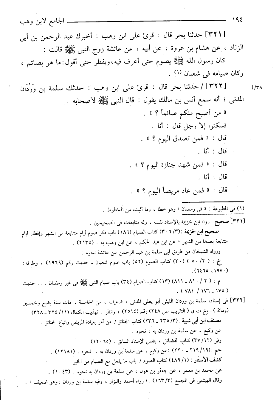٣٢١-[٣١٣] حدثنا بحر قال: قرئ على ابن وهب: أخبرك عبد الرحمن بن أبي الزناد، عن هشام بن عروة، عن أبيه، عن عائشة زوج النبي صلى الله عليه وسلم قالت: