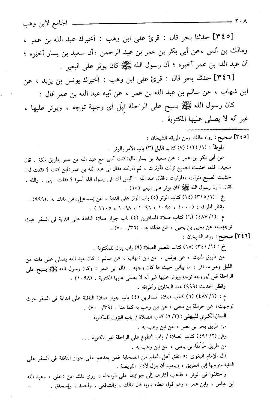 ٣٤٥-[٣٣٤] حدثنا بحر قال: قرئ على ابن وهب: أخبرك عبد الله بن عمر، ومالك بن أنس، عن أبي بكر بن عمر بن عبد الرحمن؛ أن سعيد بن يسار أخبره؛ أن عبد الله بن عمر أخبره؛ أن رسول الله صلى الله عليه وسلم كان يوتر على البعير.