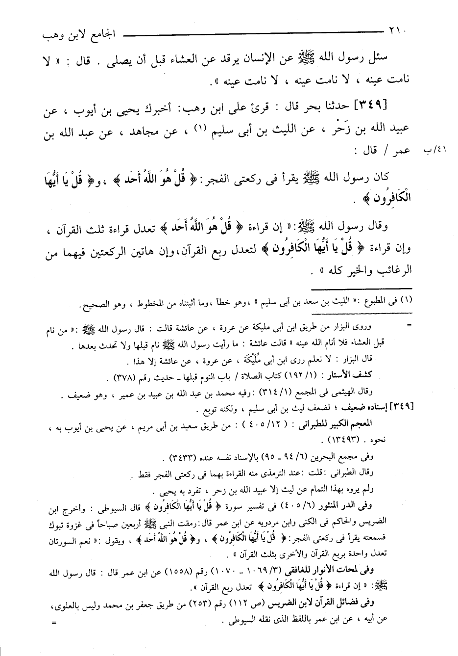 ٣٤٩-[٣٣٨] حدثنا بحر قال: قرئ على ابن وهب: أخبرك يحيى بن أيوب، عن عبيد الله بن زحر، عن الليث بن أبي سليم، عن مجاهد، عن عبد الله بن عمر قال: