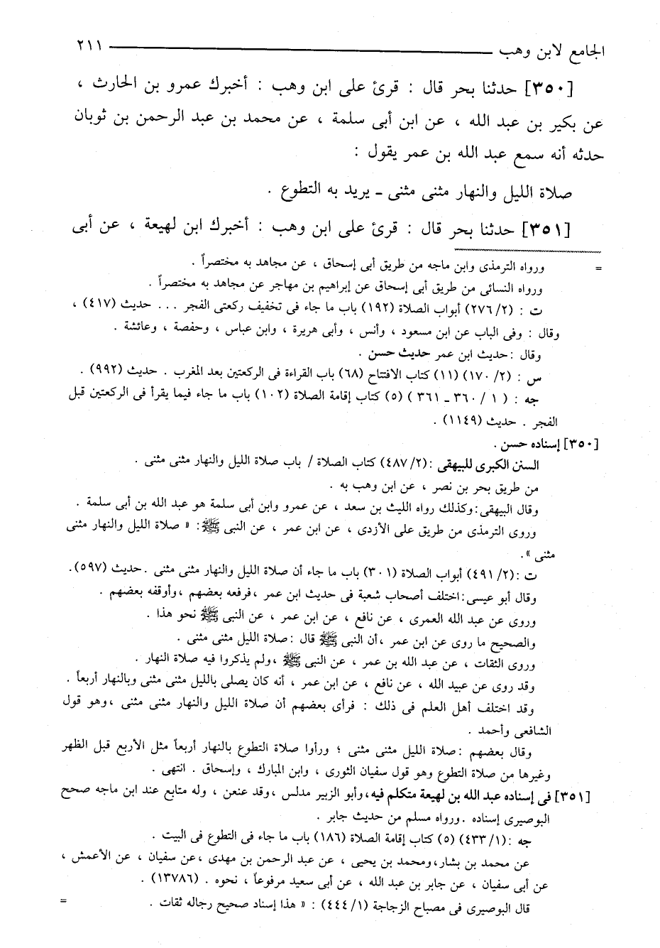 ٣٥٠-[٣٣٩] حدثنا بحر قال: قرئ على ابن وهب: أخبرك عمرو بن الحارث، عن بكير بن عبد الله، عن [ابن] أبي سلمة، عن محمد بن عبد الرحمن بن ثوبان حدثه أنه سمع عبد الله بن عمر يقول: