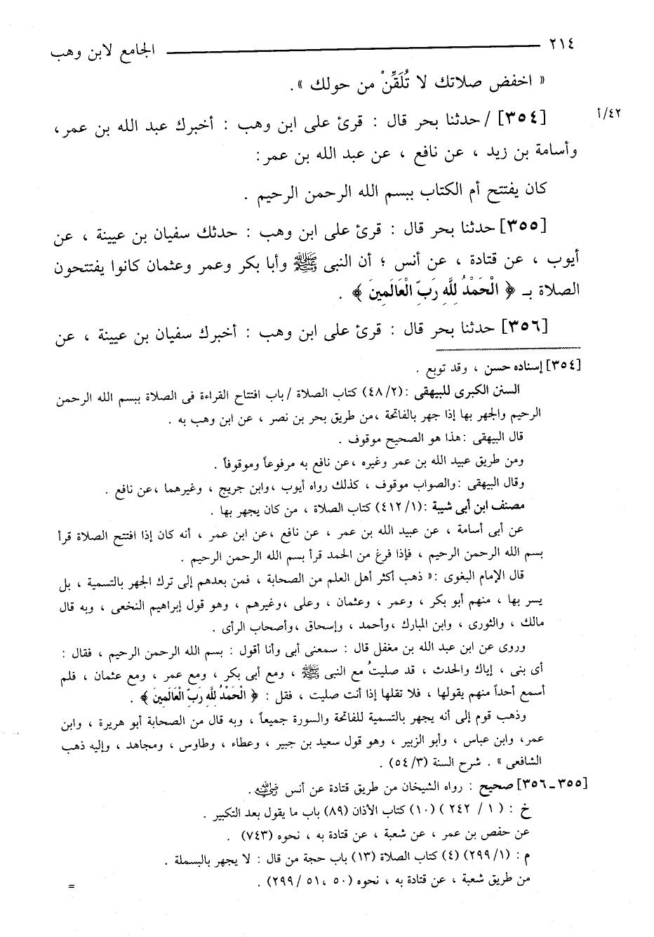 ٣٥٥-[٣٤٤] حدثنا بحر قال: قرئ على ابن وهب: حدثك سفيان بن عيينة، عن أيوب، عن قتادة، عن أنس؛ أن النبي صلى الله عليه وسلم وأبا بكر وعمر وعثمان كانوا يفتتحون الصلاة بـ {الحمد لله رب العالمين} .