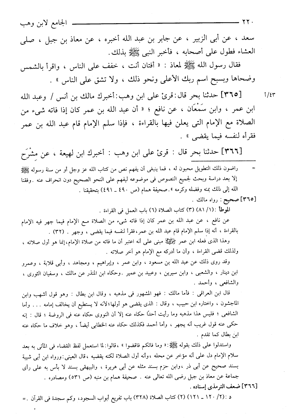 ٣٦٥-[٣٥٤] حدثنا بحر قال: قرئ على ابن وهب: أخبرك مالك بن أنس وعبد الله ابن عمر، وابن سمعان، عن نافع؛ ((أن عبد الله بن عمر كان إذا فاته شيء من الصلاة مع الإمام التي يعلن فيها بالقراءة، فإذا سلم الإمام قام عبد الله بن عمر فقرأه لنفسه فيما يقضي)) .