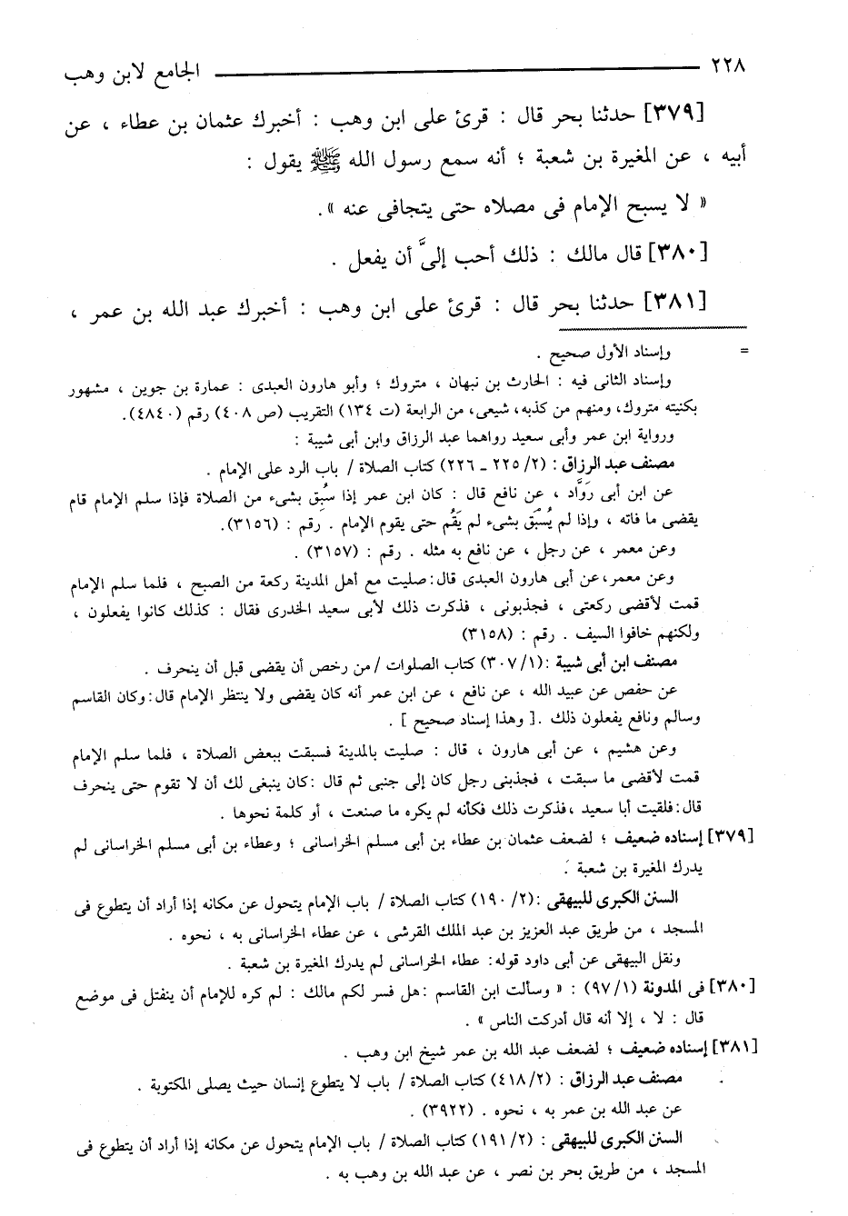 ٣٨١-[٣٦٧] حدثنا بحر قال: قرئ على ابن وهب: أخبرك عبد الله بن عمر، ⦗٢٢٩⦘ عن نافع؛ أن عبد الله بن عمر كان يصلي سبحته في مقامه الذي صلى فيه.
