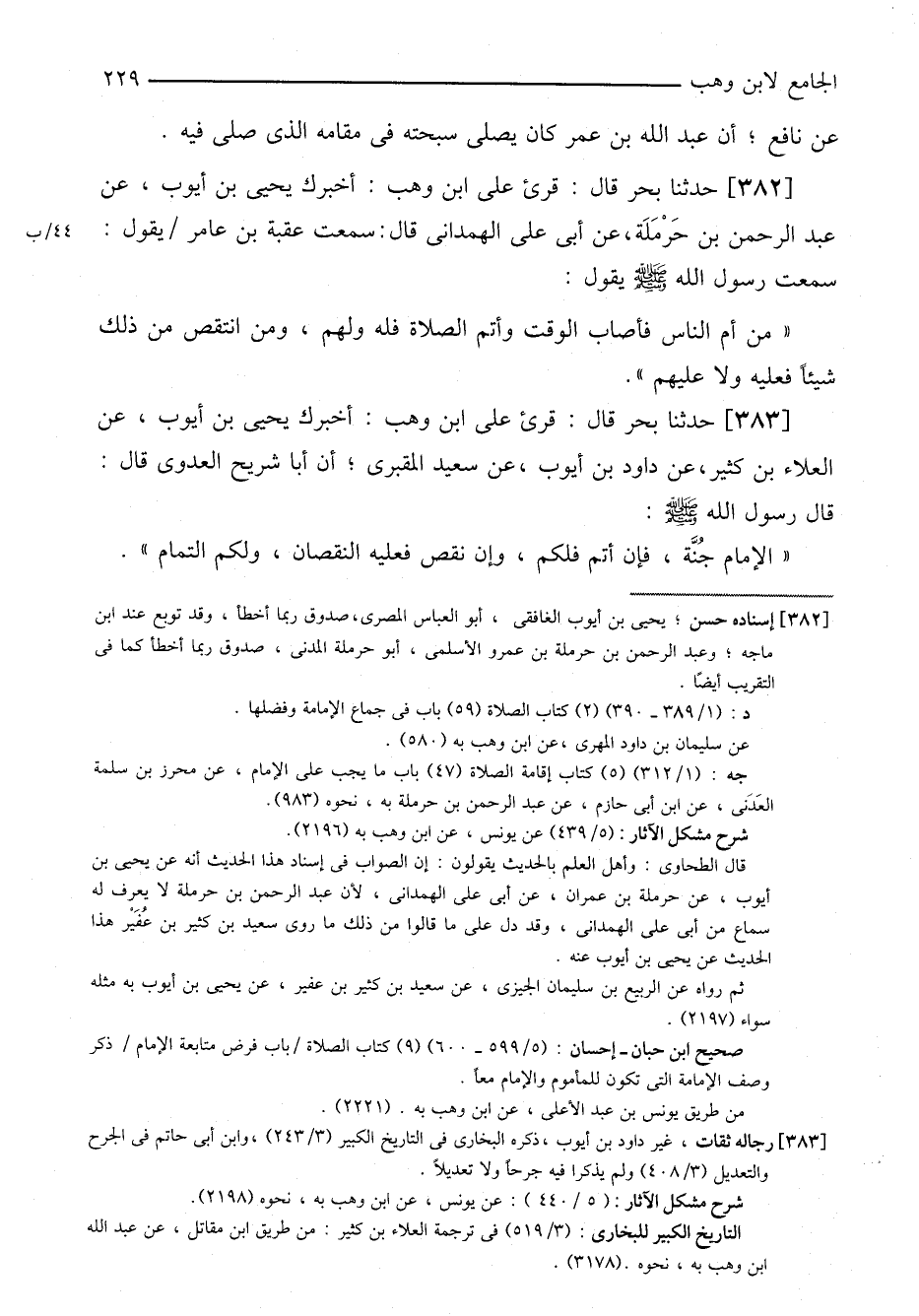 ٣٨٢-[٣٦٨] حدثنا بحر قال: قرئ على ابن وهب: أخبرك يحيى بن أيوب، عن عبد الرحمن بن حرملة، عن أبي علي الهمداني قال: سمعت عقبة بن عامر يقول: سمعت رسول الله صلى الله عليه وسلم يقول: