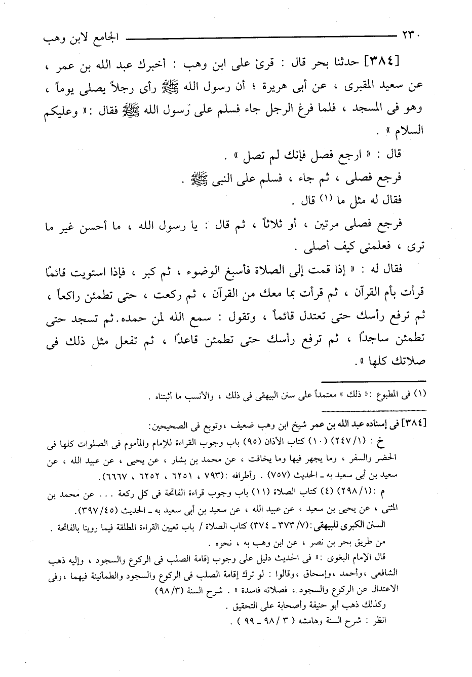 ٣٨٤-[٣٧٠] حدثنا بحر قال: قرئ على ابن وهب: أخبرك عبد الله بن عمر، عن سعيد المقبري، عن أبي هريرة؛ أن رسول الله صلى الله عليه وسلم رأى رجلاً يصلي يوماً، وهو في المسجد، فلما فرغ الرجل جاء فسلم على رسول الله صلى الله عليه وسلم فقال: ((وعليكم السلام)) .