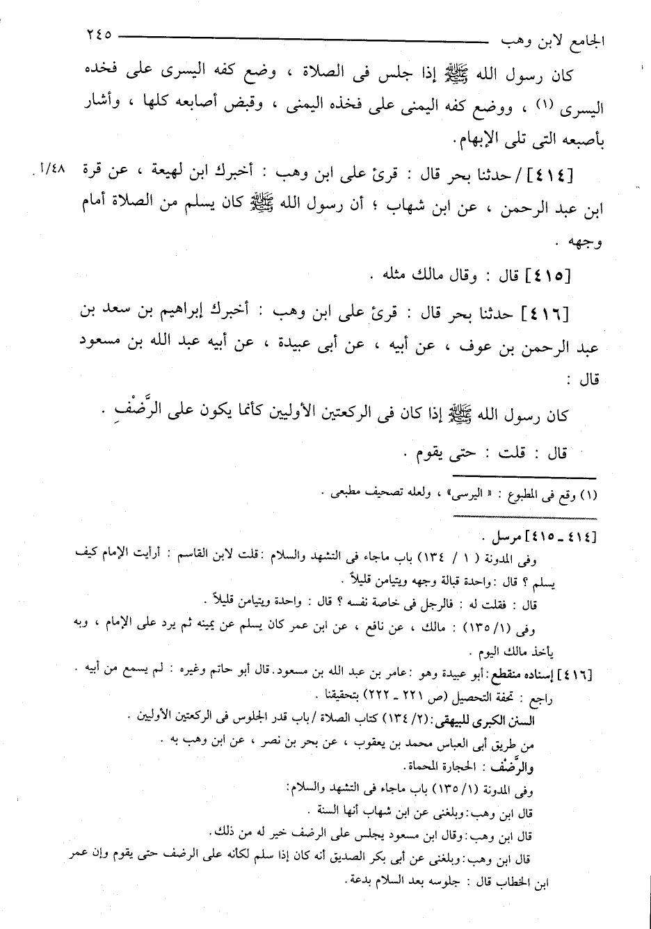 ٤١٤-[٣٩٨] حدثنا بحر قال: قرئ على ابن وهب: أخبرك ابن لهيعة، عن قرة ابن عبد الرحمن، عن ابن شهاب؛ أن رسول الله صلى الله عليه وسلم كان يسلم من الصلاة أمام وجهه.