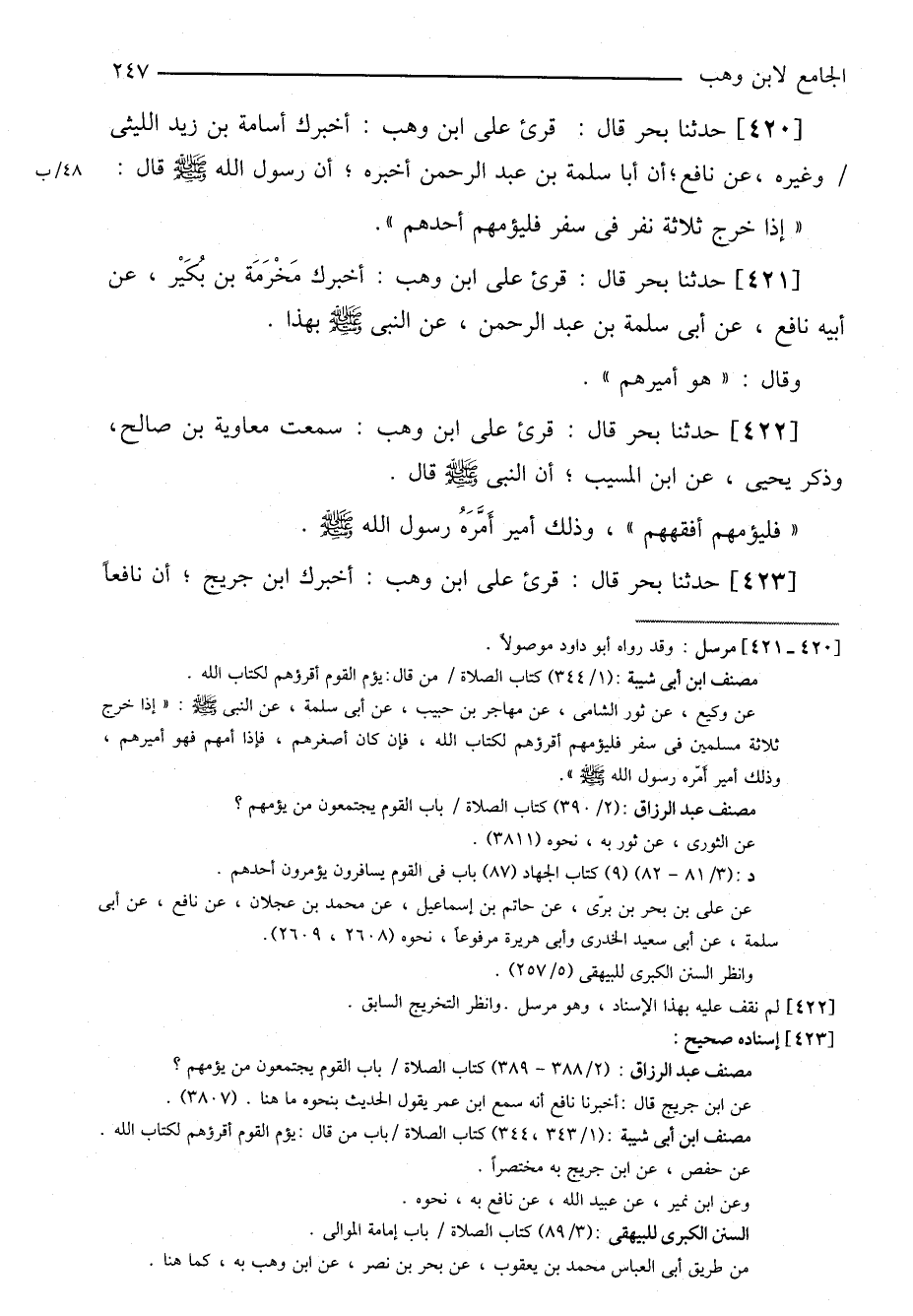 ٤٢٠-[٤٠٣] حدثنا بحر قال: قرئ على ابن وهب: أخبرك أسامة بن زيد الليثي وغيره، عن نافع؛ أن أبا سلمة بن عبد الرحمن أخبره؛ أن رسول الله صلى الله عليه وسلم قال: