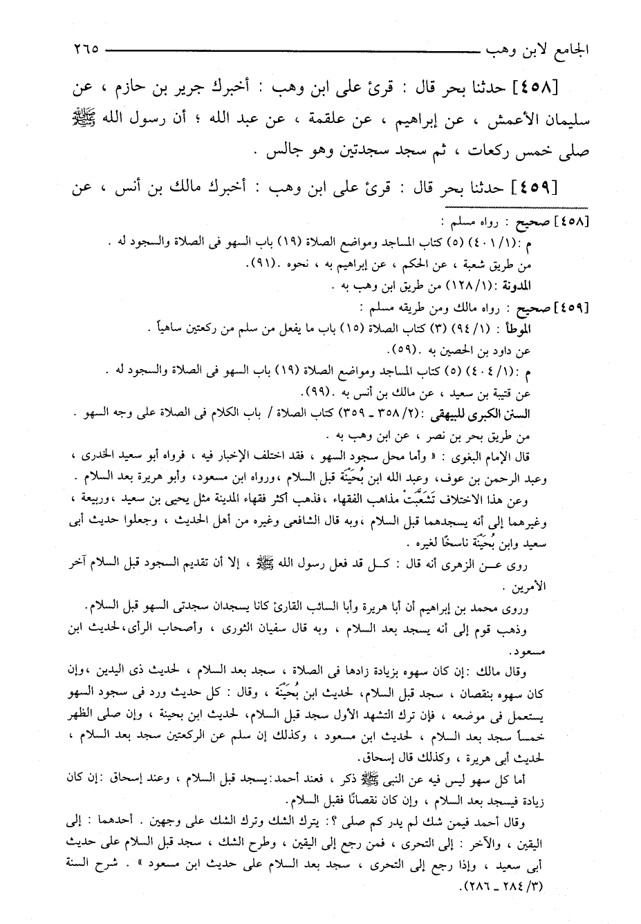 ٤٥٨-[٤٣٧] حدثنا بحر قال: قرئ على ابن وهب: أخبرك جرير بن حازم، عن سليمان الأعمش، عن إبراهيم، عن علقمة، عن عبد الله؛ أن رسول الله صلى الله عليه وسلم صلى خمس ركعات، ثم سجد سجدتين وهو جالس.