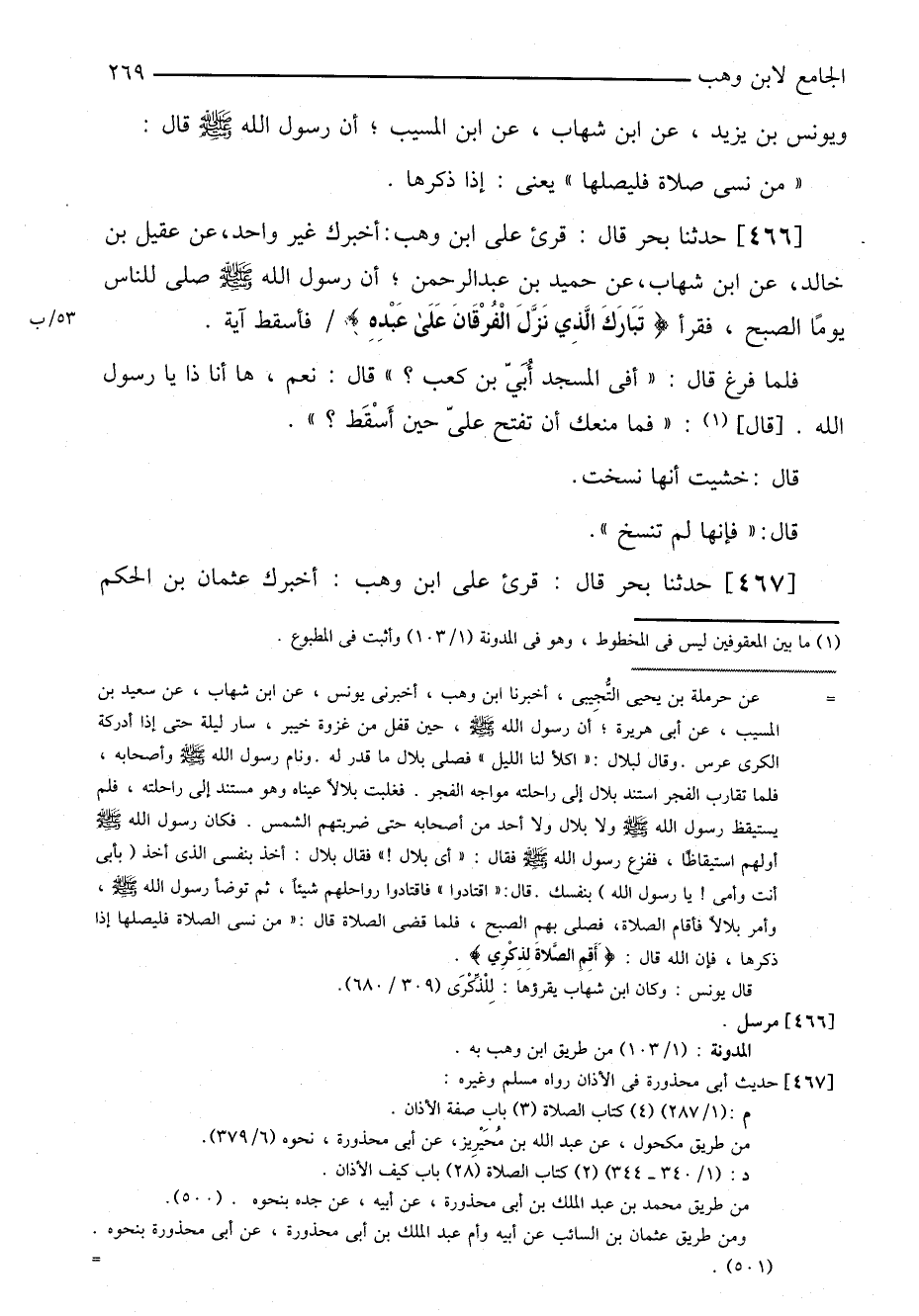 ٤٦٦-[٤٤٤] حدثنا بحر قال: قرئ على ابن وهب: أخبرك غير واحد، عن عقيل بن خالد، عن ابن شهاب، عن حميد بن عبد الرحمن؛ أن رسول الله صلى الله عليه وسلم صلى للناس يوماً الصبح، فقرأ {تبارك الذي نزل الفرقان على عبده} فأسقط آية.