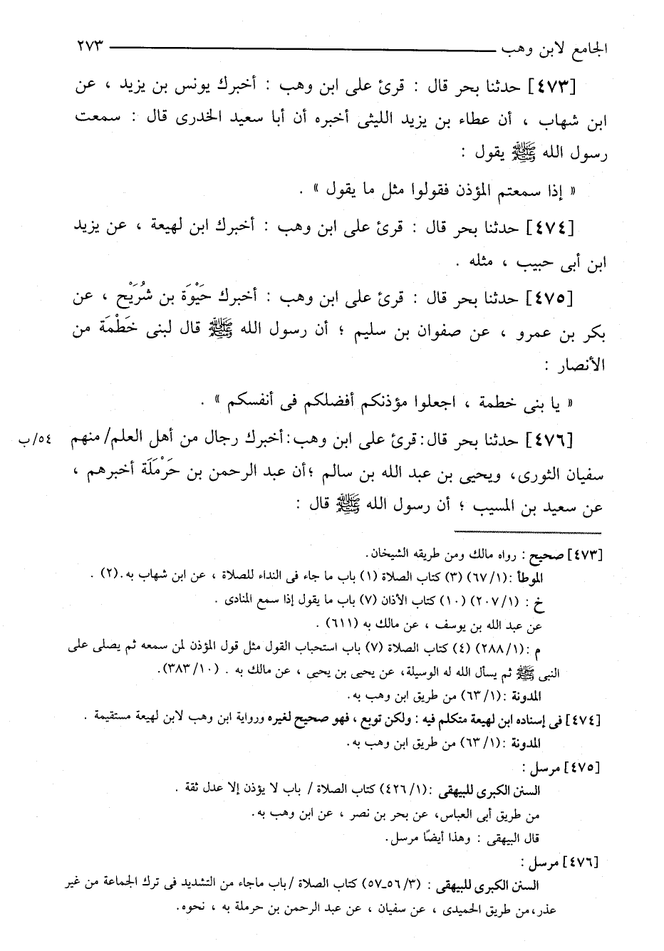 ٤٧٦-[٤٥١] حدثنا بحر قال: قرئ على ابن وهب: أخبرك رجال من أهل العلم منهم سفيان الثوري، ويحيى بن عبد الله بن سالم؛ أن عبد الرحمن بن حرملة أخبرهم، عن سعيد بن المسيب؛ أن رسول الله صلى الله عليه وسلم قال: