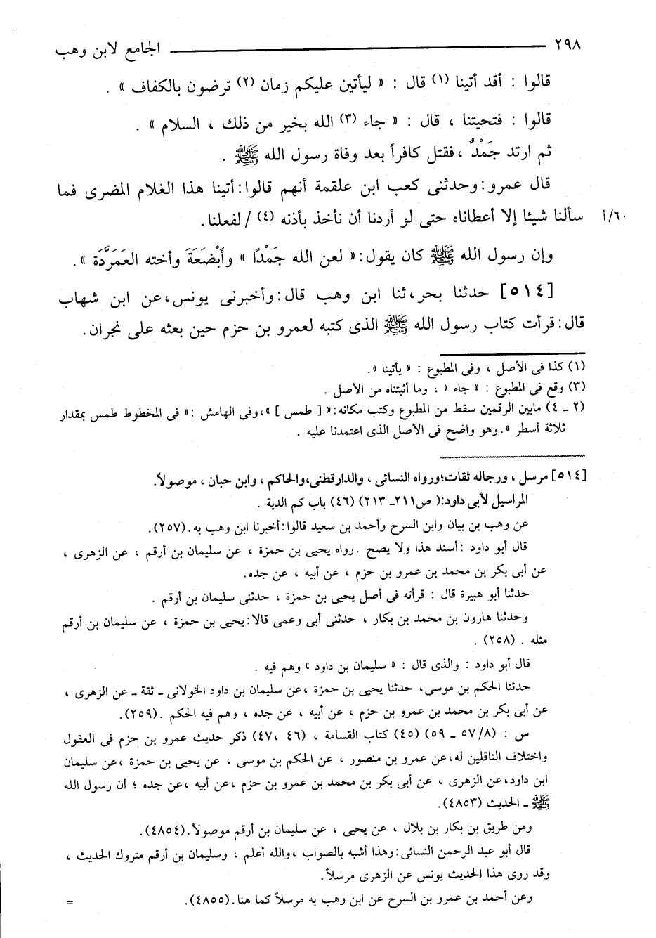 ٥١٤-[٤٨٦] حدثنا بحر، ثنا ابن وهب قال: وأخبرني يونس، عن ابن شهاب قال: قرأت كتاب رسول الله صلى الله عليه وسلم الذي كتبه لعمرو بن حزم حين بعثه على نجران.