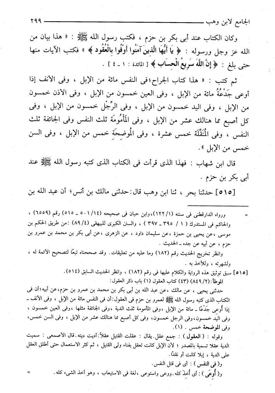 ٥١٥-[٤٨٧] حدثنا بحر، ثنا ابن وهب قال: حدثني مالك بن أنس؛ أن عبد الله بن ⦗٣٠٠⦘ أبي بكر أخبره؛ أن أباه أخبره عن الكتاب الذي كتبه رسول الله صلى الله عليه وسلم لعمرو بن حزم في العقول مثل حديث ابن شهاب.
