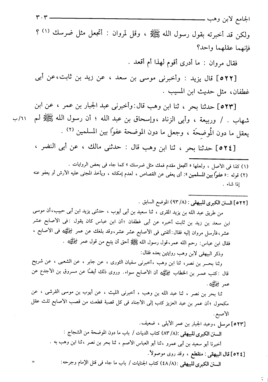 ٥٢٣-[٤٩٣] حدثنا بحر، ثنا ابن وهب قال: وأخبرني عبد الجبار بن عمر، عن ابن شهاب. وربيعة، وأبي الزناد، وإسحاق بن عبد الله؛ أن رسول الله صلى الله عليه وسلم لم يعقل ما دون الموضحة، وجعل ما دون الموضحة عفواً بين المسلمين.