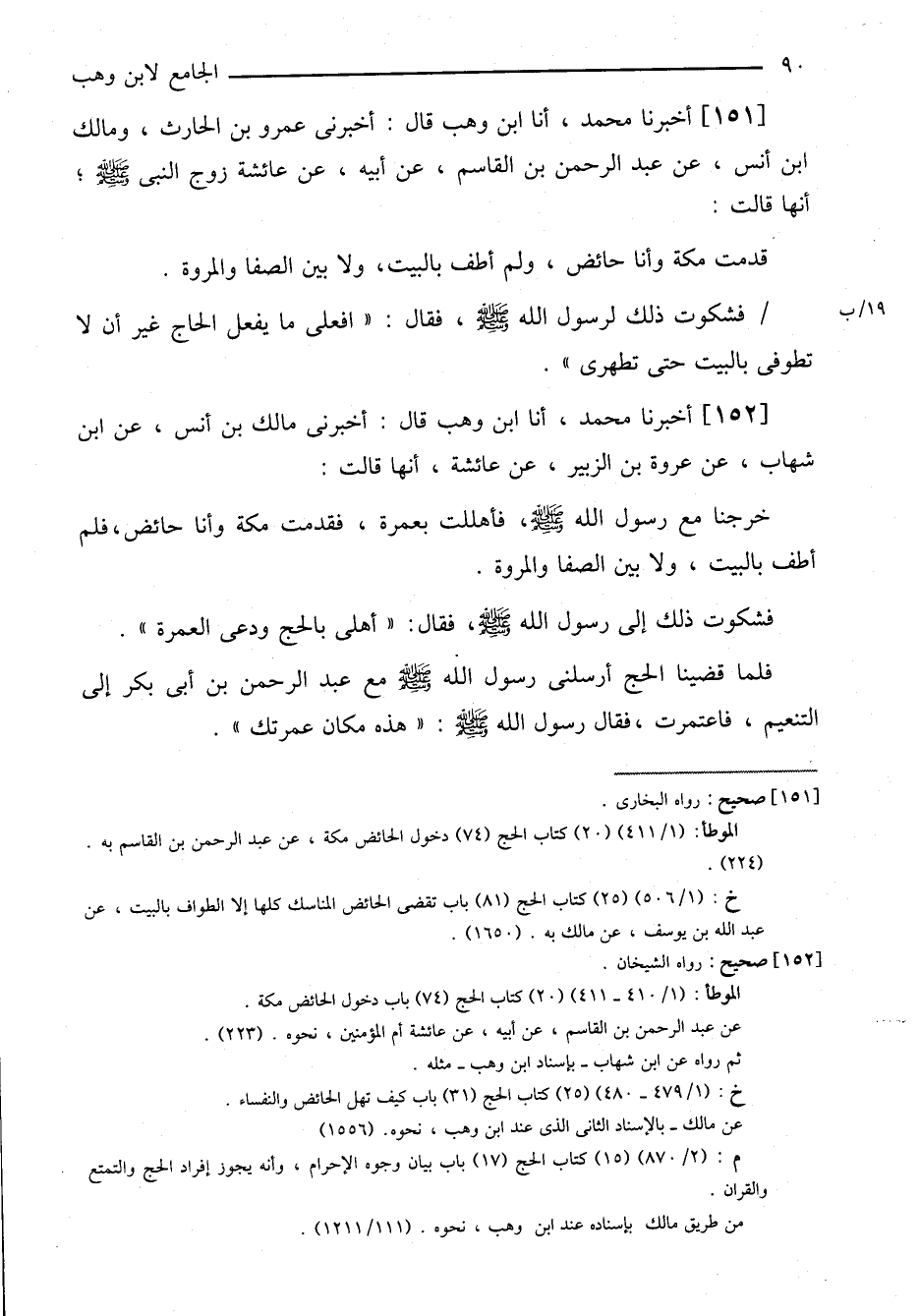 ١٥١-[١٤٦] أخبرنا محمد، أنا ابن وهب قال: أخبرني عمرو بن الحارث، ومالك ابن أنس، عن عبد الرحمن بن القاسم، عن أبيه، عن عائشة زوج النبي صلى الله عليه وسلم؛ أنها قالت: