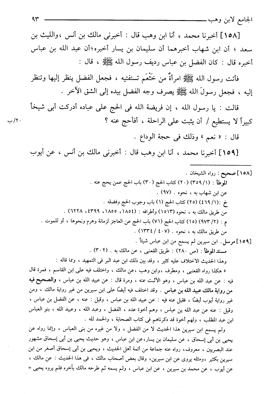 ١٥٨-[١٥٢] أخبرنا محمد، أنا ابن وهب قال: أخبرني مالك بن أنس، والليث بن سعد؛ أن ابن شهاب أخبرهما أن سليمان بن يسار أخبره؛ أن عبد الله بن عباس أخبره قال: كان الفضل بن عباس رديف رسول الله صلى الله عليه وسلم، قال: