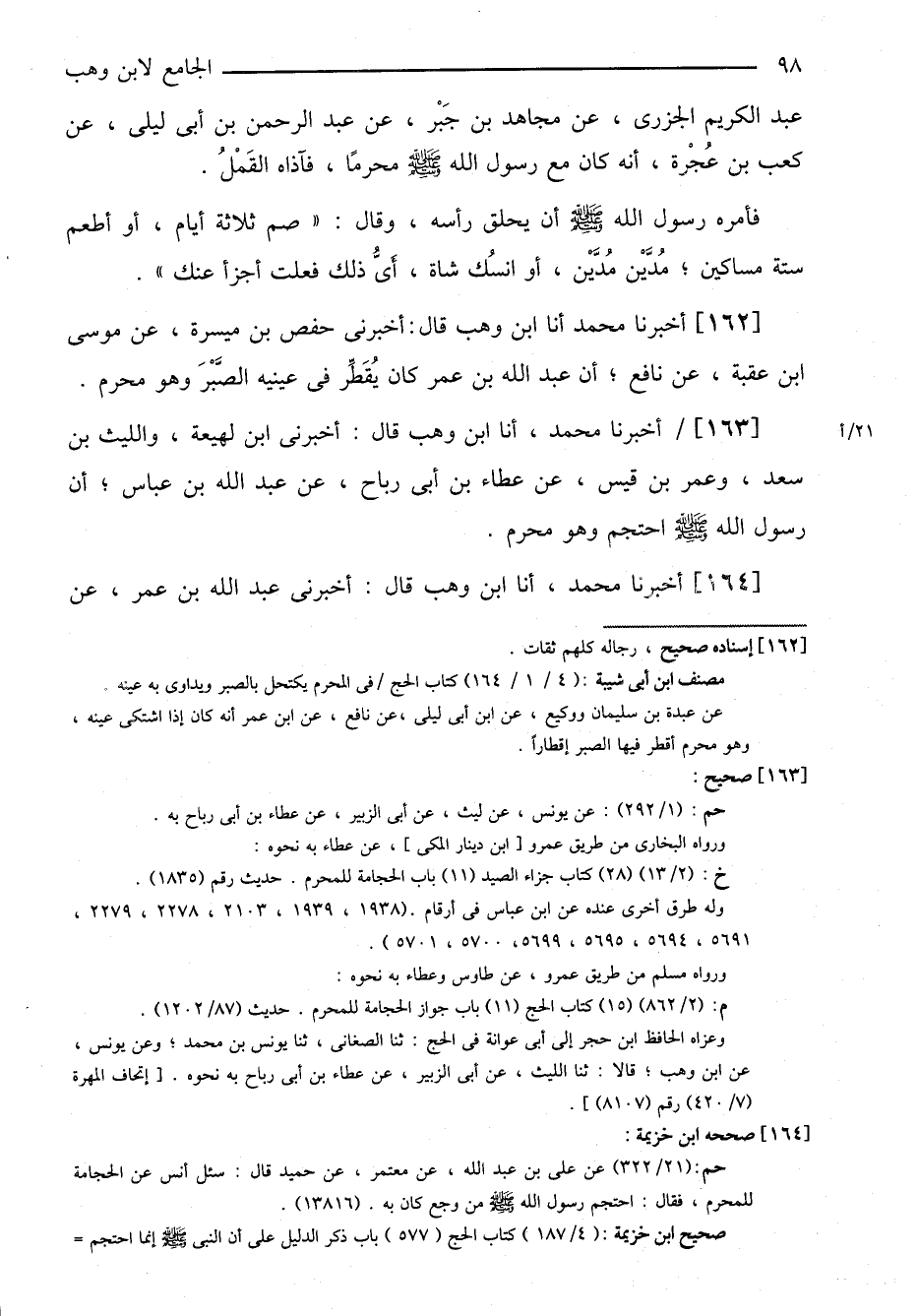 ١٦٣-[١٥٧] أخبرنا محمد، أنا ابن وهب قال: أخبرني ابن لهيعة، والليث بن سعد، وعمر بن قيس، عن عطاء بن أبي رباح، عن عبد الله بن عباس؛ أن رسول الله صلى الله عليه وسلم احتجم وهو محرم.