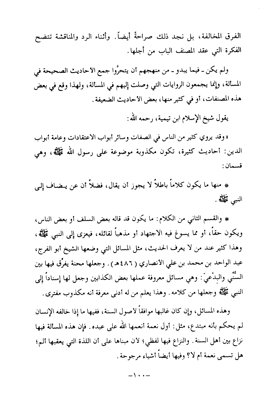 والقسم الثاني من الكلام: ما يكون قد قاله بعض السلف أو بعض الناس، ويكون حقا أو مما يسوغ فيه الاجتهاد, أو مذهبا لقائله، فيعزى إلى النبي صلى الله عليه وسلم، وهذا كثير عند من لا يعرف الحديث، مثل المسائل التي وضعها الشيخ أبو الفرج، عبد الواحد بن محمد بن علي الأنصاري "486هـ", وجعلها محنة يفرق فيها بين السني والبدعي. وهي مسائل معروفة عملها بعض الكذابين وجعل لها إسنادا إلى النبي -صلى الله عليه وسلم- وجعلها من كلامه. وهذا يعلم من له أدنى معرفة أنه مكذوب مفترى.