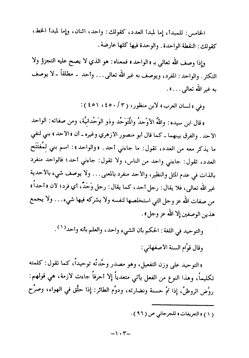 وإذا وصف الله تعالى بـ "الواحد" فمعناه: هو الذي لا يصح عليه التجزؤ ولا التكثر. والواحد: المفرد، ويوصف به غير الله تعالى ... وأحد -مطلقا- لا يوصف به غير الله تعالى ... ".