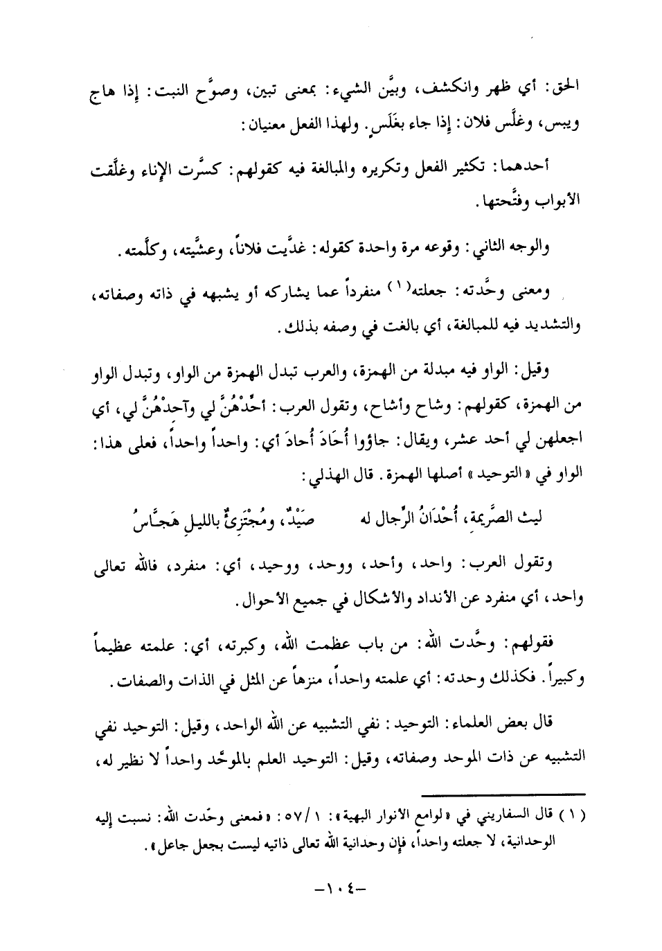 1 قال السفاريني في "لوامع الأنوار البهية" 1/ 57: "فمعنى وحّدت الله: نسبت إليه الوحدانية، لا جعلته واحدا، فإن وحدانية الله تعالى ذاتيه ليست بجعل جاعل".