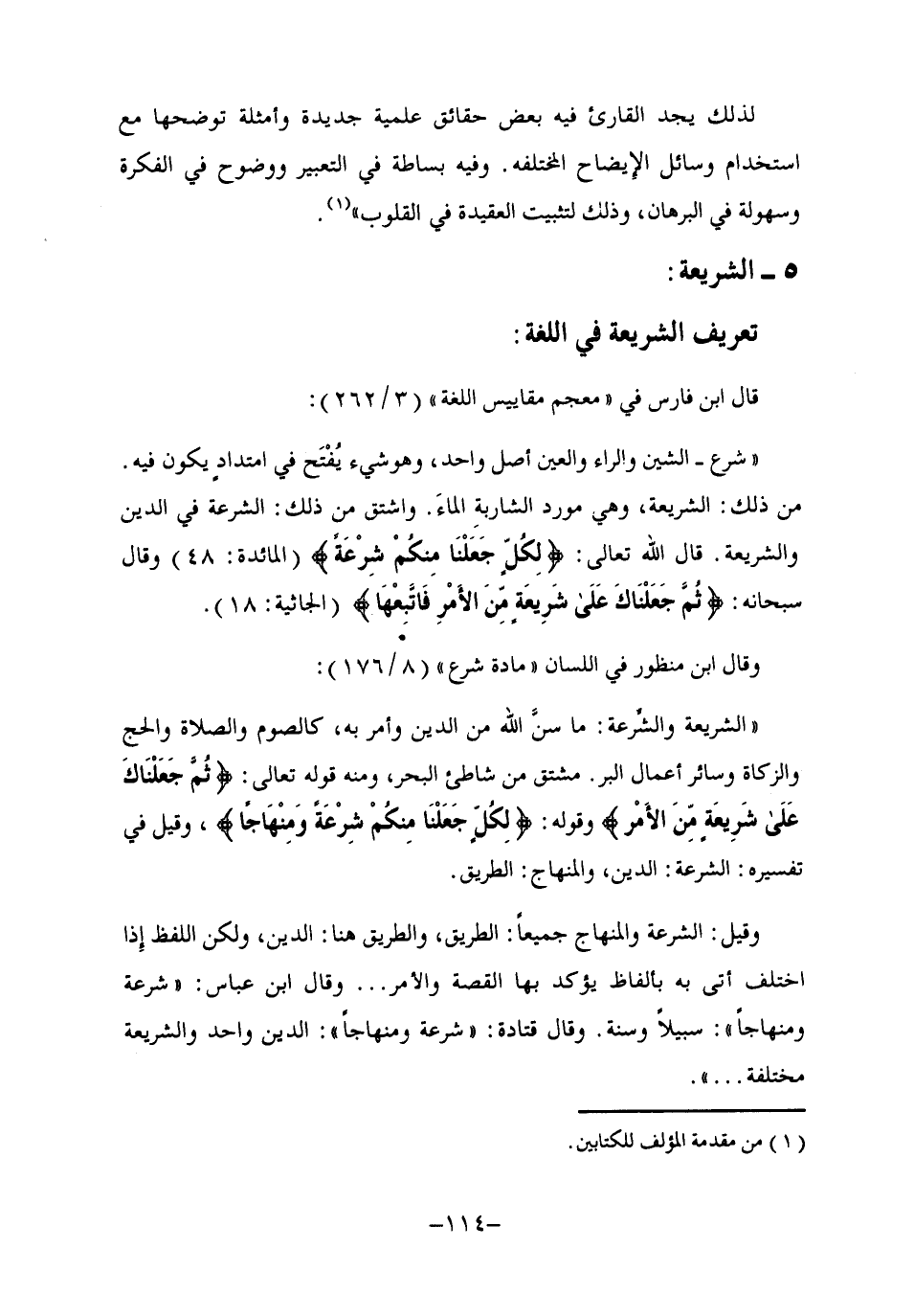 "شرع: الشين والراء والعين أصل واحد، وهو شيء يُفْتَح في امتداد يكون فيه. من ذلك: الشريعة، وهي مورد الشاربة الماء. واشتق من ذلك: الشرعة في الدين, والشريعة. قال الله تعالى: {لِكُلٍّ جَعَلْنَا مِنْكُمْ شِرْعَةً} [المائدة: 48] , وقال سبحانه: {ثُمَّ جَعَلْنَاكَ عَلَى شَرِيعَةٍ مِنَ الْأَمْرِ فَاتَّبِعْهَا} [الجاثية: 18] ".