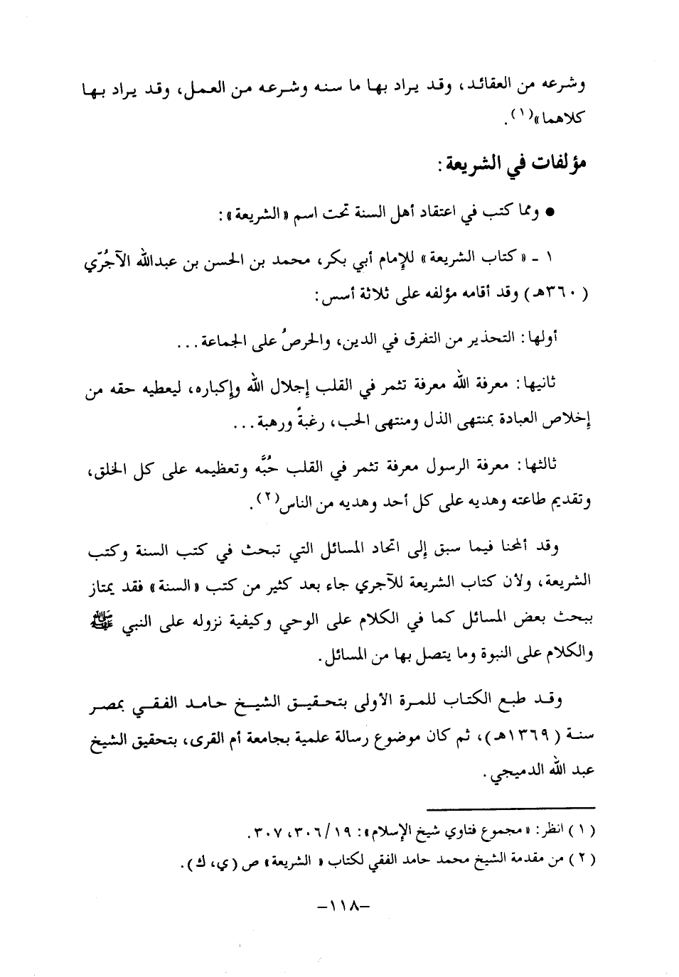 1- "كتاب الشريعة" للإمام أبي بكر، محمد بن الحسن بن عبد الله الآجُرّي "360هـ", وقد أقامه مؤلفه على ثلاثة أسس: