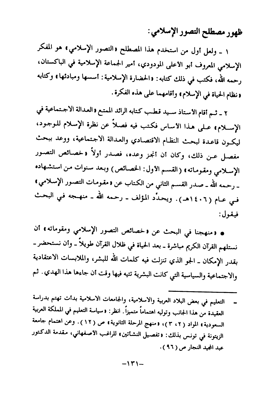 2- ثم أقام الأستاذ سيد قطب كتابه الرائد الممتع "العدالة الاجتماعية في الإسلام" على هذا الأساس, فكتب فيه فصلا عن نظرة الإسلام للوجود؛ ليكون قاعدة لبحث النظام الاقتصادي والعدالة الاجتماعية، ووعد ببحث مفصل عن ذلك، وكان أن أنجز وعده، فصدر أولا "خصائص التصور الإسلامي ومقوماته" "القسم الأول: الخصائص" وبعد سنوات من استشهاده -رحمه الله- صدر القسم الثاني من الكتاب عن "مقومات التصور الإسلامي" في عام "1406هـ". ويحدد المؤلف -رحمه الله- منهجه في البحث فيقول:
