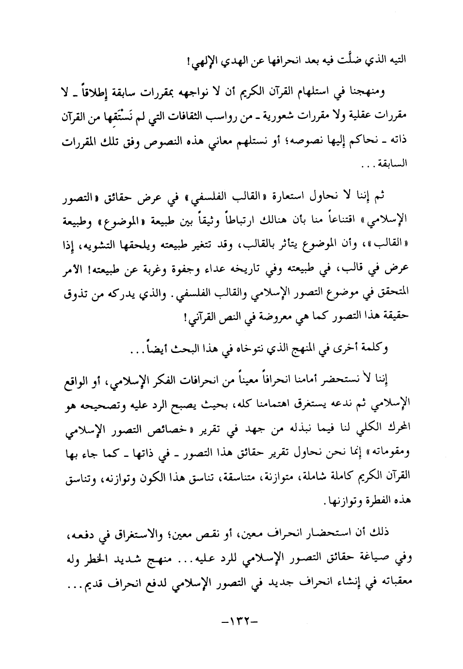 إننا لا نستحضر أمامنا انحرافا معينا من انحرافات الفكر الإسلامي، أو الوقائع الإسلامي ثم ندعه يستغرق اهتمامنا كله، بحيث يصبح الرد عليه وتصحيحه هو المحرك الكلي لنا فيما نبذله من جهد في تقرير "خصائص التصور الإسلامي ومقوماته", إنما نحن نحاول تقرير حقائق هذا التصور -في ذاتها- كما جاء بها القرآن الكريم كاملة شاملة، متوازنة، متناسقة تناسق هذا الكون وتوازنه، وتناسق هذه الفطرة وتوازنها.
