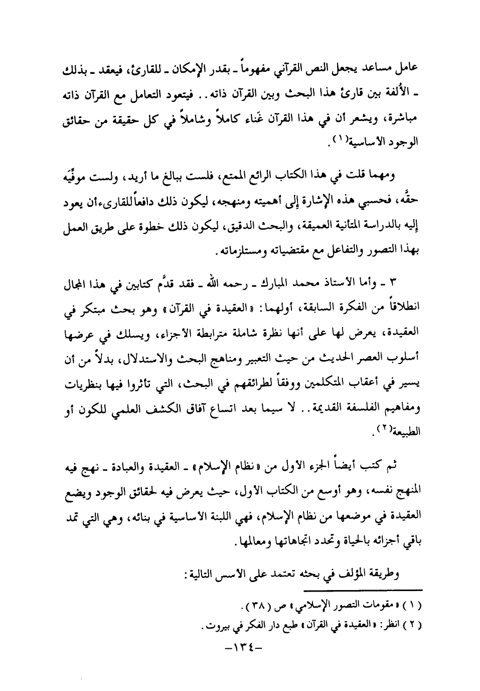 3- وأما الأستاذ محمد المبارك -رحمه الله- فقد قدَّم كتابين في هذا المجال انطلاقا من الفكرة السابقة، أولهما: "العقيدة في القرآن" وهو بحث مبتكر في العقيدة، يعرض لها على أنها نظرة شاملة مترابطة الأجزاء، ويسلك في عرضها أسلوب العصر الحديث من حيث التعبير ومناهج البحث والاستدلال، بدلا من أن يسير في أعقاب المتكلمين ووفقا لطرائقهم في البحث، التي تأثروا فيها بنظريات ومفاهيم الفلسفة القديمة.. لا سيما بعد اتساع آفاق الكشف العلمي للكون أو الطبيعة2.