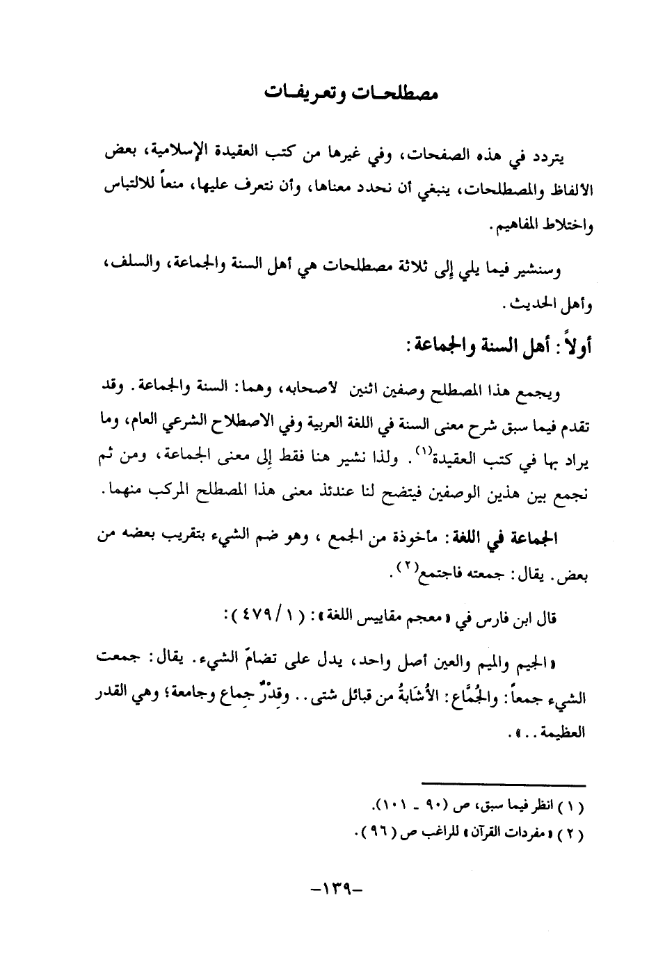 ويجمع هذا المصطلح وصفين اثنين لأصحابه، وهما: السنة والجماعة. وقد تقدم فيما سبق شرح معنى السنة في اللغة العربية وفي الاصطلاح الشرعي العام، وما يراد بها في كتب العقيدة1. ولذا نشير هنا فقط إلى معنى الجماعة، ومن ثَمَّ نجمع بين هذين الوصفين فيتضح لنا عندئذ معنى هذا المصطلح المركب منهما.