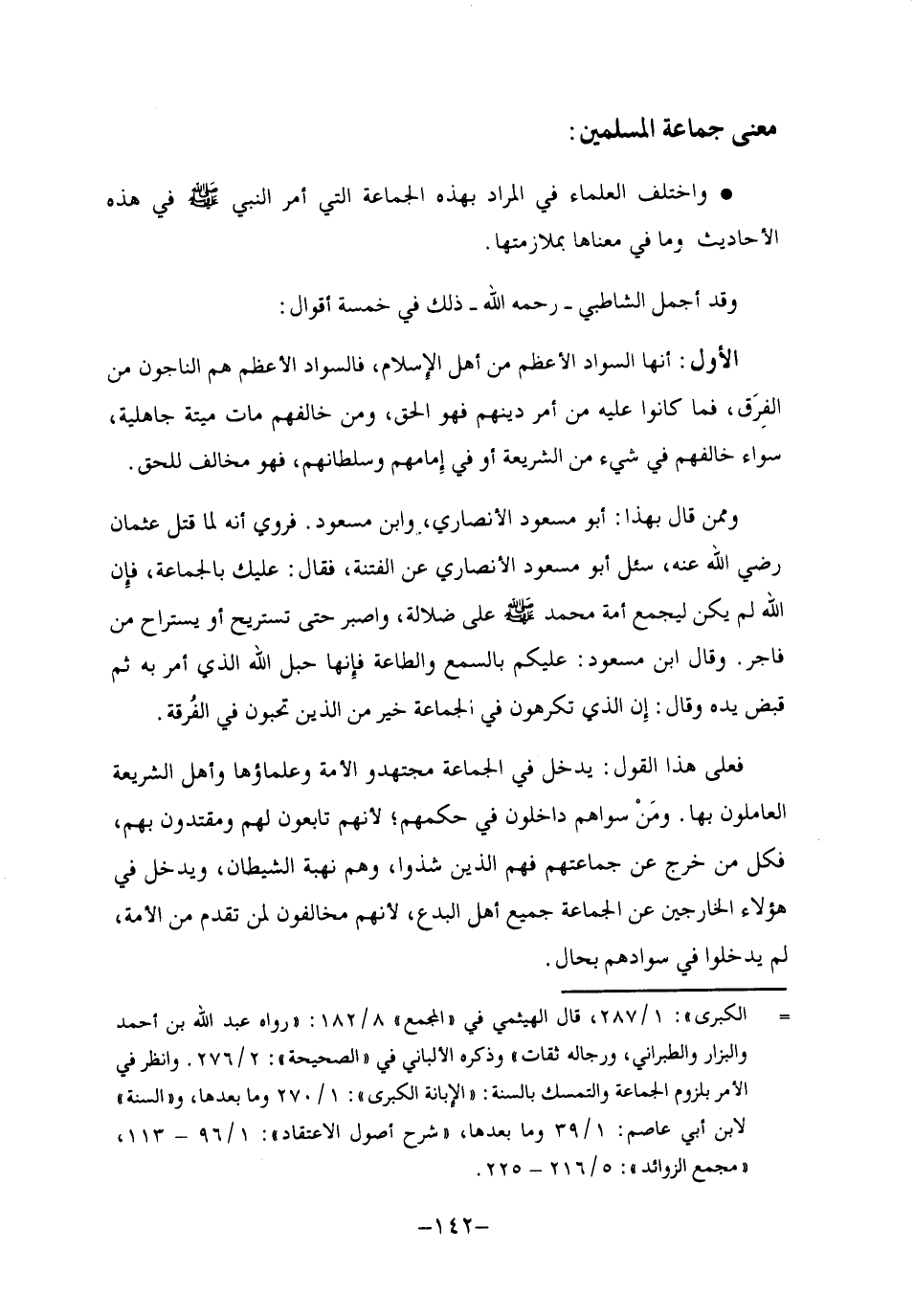 الأول: أنها السواد الأعظم من أهل الإسلام، فالسواد الأعظم هم الناجون من الفِرَق، فما كانوا عليه من أمر دينهم فهو الحق، ومن خالفهم مات ميتة جاهلية، سواء خالفهم في شيء من الشريعة أو في إمامهم وسلطانهم، فهو مخالف للحق.