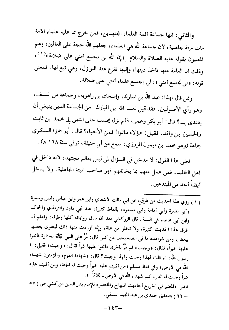 وممن قال بهذا: عبد الله بن المبارك وإسحاق بن راهويه، وجماعة من السلف، وهو رأي الأصوليين. فقد قيل لعبد الله بن المبارك: من الجماعة الذين ينبغي أن يقتدى بهم؟ قال: أبو بكر وعمر، فلم يزل يحسب حتى انتهى إلى محمد بن ثابت والحسين بن واقد. فقيل: هؤلاء ماتوا! فمن الأحياء؟ قال: أبو حمزة السكري جماعة "وهو محمد بن ميمون المروزي، سمع من أبي حنيفة، توفي سنة 168هـ".