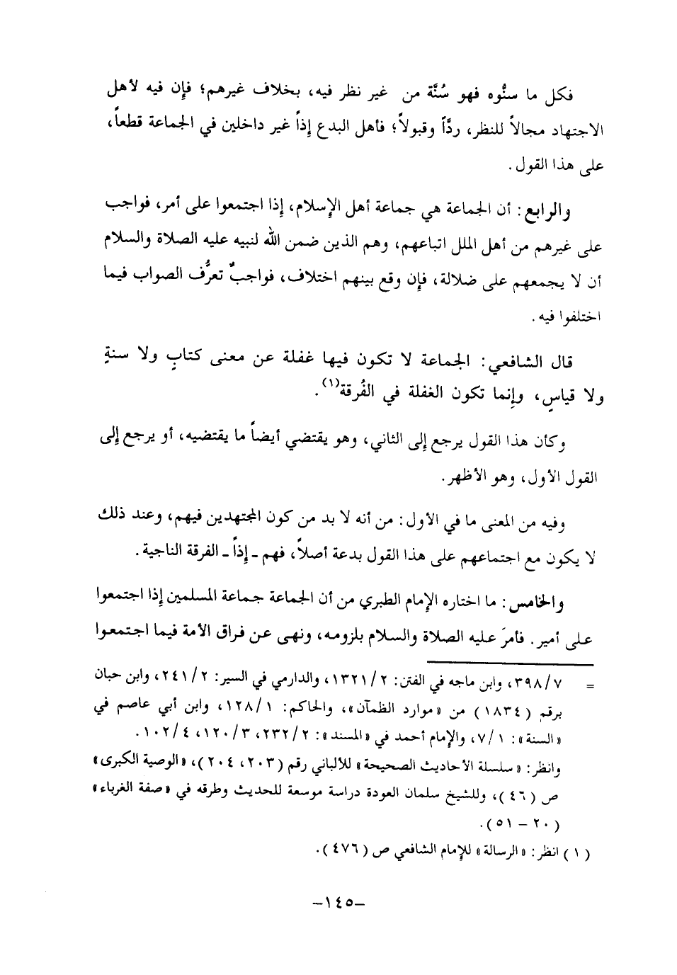 والرابع: أن الجماعة هي جماعة أهل الإسلام, إذا اجتمعوا على أمر، فواجب على غيرهم من أهل الملل اتباعهم، وهم الذين ضمن الله لنبيه -عليه الصلاة والسلام- أن لا يجمعهم على ضلالة، فإن وقع بينهم اختلاف، فواجب تعرّف الصواب فيما اختلفوا فيه.