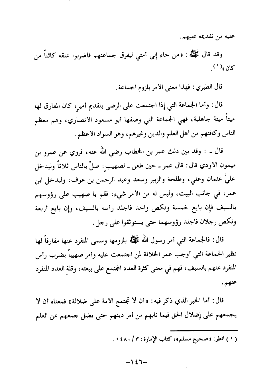 قال: فالجماعة التي أمر رسول الله -صلى الله عليه وسلم- بلزومها وسمى المنفرد عنها مفارقا لها نظير الجماعة التي أوجب عمر الخلافة لمن اجتمعت عليه وأمر صهيبا بضرب رأس المنفرد عنهم بالسيف، فهم في معنى كثرة العدد المجتمع على بيعته، وقلة العدد المنفرد عنهم.